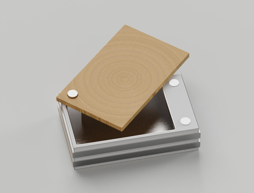 Lunch Set DesignIt's sealed by magnets?Brief - Design a Lunch box for the 'explorer'.The explorer is a User persona that takes part in activity and is exposed to various terrain. This would encompass Hikers, Campers, and Adventurers. They need durable equipment which is adapted to their lifestyle and Containers to carry their food.Solution: The Design features a lunchbox with rubber strips around the perimeter for grip on a stainless steel base, with an oak lid secured and sealed using magnets. The lid pivots about a point where it can be rotated outwards and used as an additional surface for dining. When bringing the lid to close, the two magnets secure it in place.