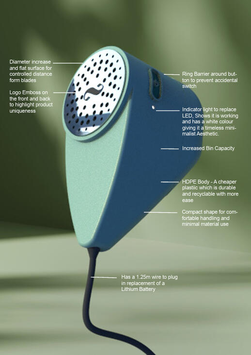 An Eco-friendly redesign, for a fabric shaver.What was the initial product?A re-chargeable fabric shaver with an LED screen showing the battery status. It used 6 blades , and motor technology to solve the problem of renewing clothing.Brief - Complete a life cycle analysis to re-design a product, and generate re-design ideas.A life cycle analysis was completed to determine how the product could be improved in terms of sustainability. The focus was on reducing carbon footprint, replacing features with more efficient systems and enhancing the user experience.Solution: See details in the labelled image below